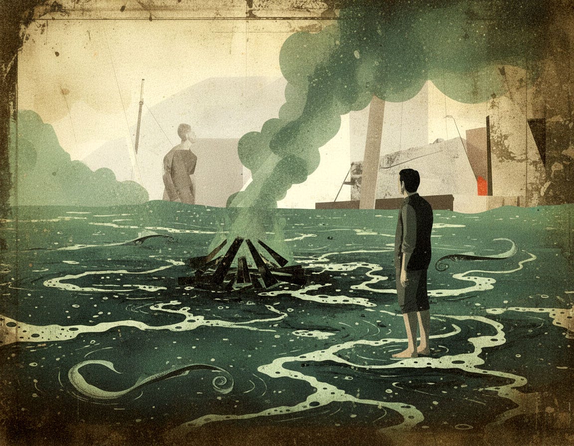the next night the stale smell of smoldering wood layered itself in gradually plummeting sheets talking and cajoling the underlayers of mist and seawater and the filmy residue of the curling skins of fishes creeping up and licking his feet in the darkness waiting to snare him unsuspectingly Hylas-like the foolishness in him taking a step closer to the edge of the sea unaware always unaware